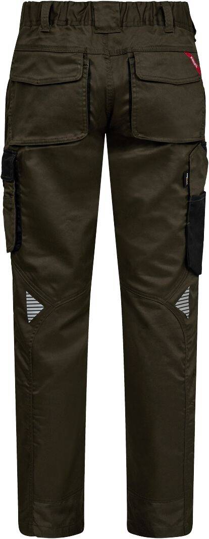 Bequeme Stretch-Arbeitshose. Elastischer Bund. Versteckte Knöpfe vorne. D-Ring für ID Card. Viele funktionnelle Taschen. Zollstocktasche mit Cordura® verstärkt. Verstärkte Knie und Unterkante mit Cordura®. Knietaschen mit verstellbaren Kniepolstern auf zwei verschiedene Höhen.