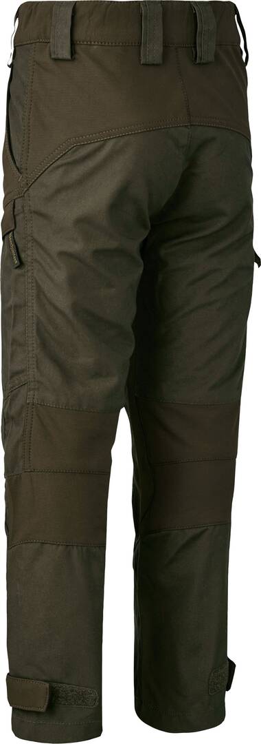 Elastischer Bund, zwei Vordertaschen, zwei Oberschenkeltaschen und eine Gesäßtasche mit verdecktem Reißverschluss, vorgeformte Knie, verstellbare Knöchel mit Riemen und Klettverschluss, elastische Kontraststoffteile für mehr Bewegungsfreiheit.