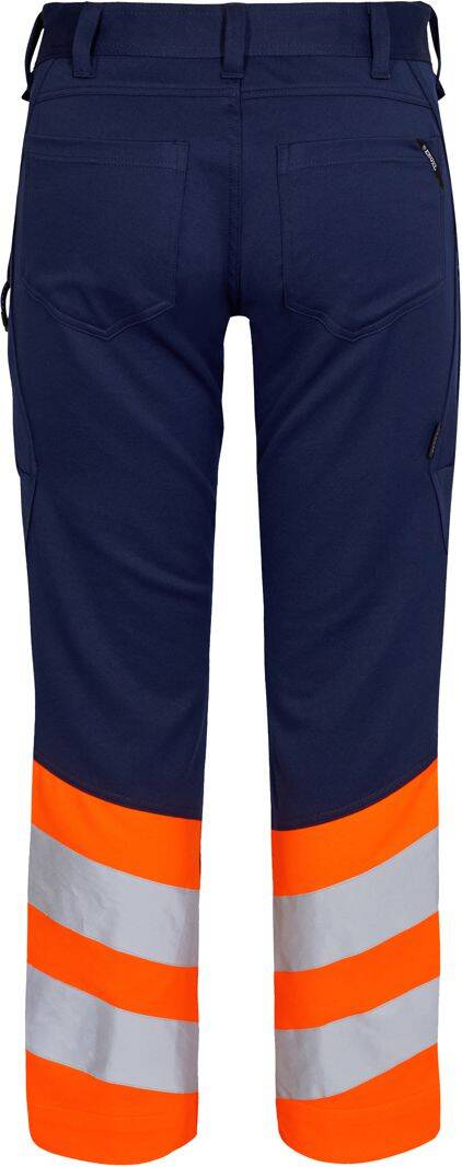 Modern geschnittene HV-Arbeitshose. Stretch. Zwei geräumige Schrägtaschen vorne. Zwei Gesäßtaschen. Zwei Schenkeltaschen mit Reißverschluss. Knietasche mit Cordura®-Verstärkung und Klettverschluss. Reflexstreifen.