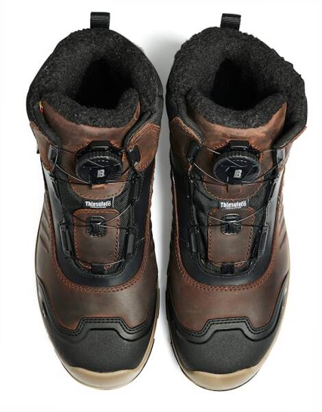 Chaussures de sécurité mi-hautes en cuir imperméable, chaudes (doublure laine/polyester + Thinsulate), avec embout composite renforcé TPU, semelle anti-perforation, adhérence optimale sur neige et glace, confort élevé et système Freelock pour un enfilage rapide.