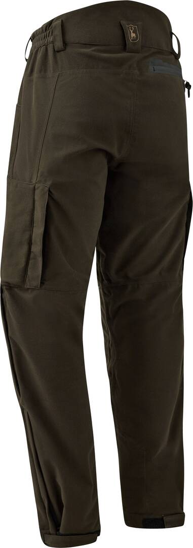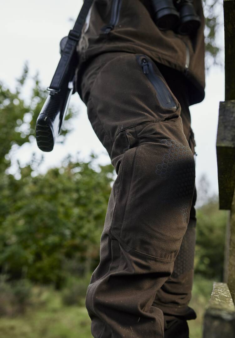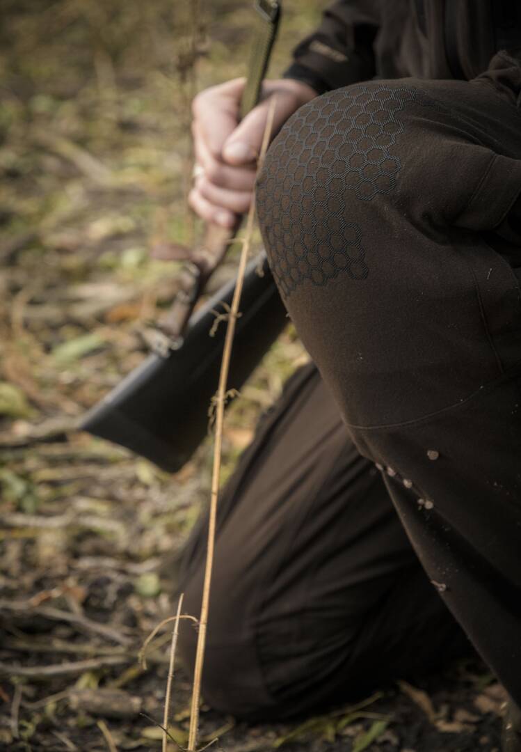 Pantalon de chasse imperméable. Élastique à la taille. Bande de silicone sur le pourtour intérieur de la taille. Deux poches avant. Deux poches sur les cuisses avec fermeture éclair imperméable. Poche arrière avec fermeture éclair imperméable. Emplacement pour genouillère. Genouillères fines incluses. Réglable à la cheville par bande velcro, fermeture éclair imperméable dissimulée au bas de la jambe. Doublure respirante.