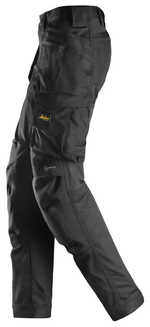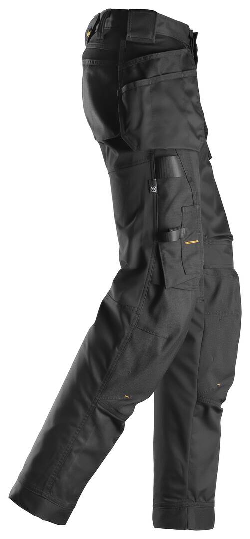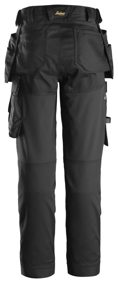 Pantalon de travail femme extensible avec poches holster. Jambes préformées. Extensible au niveau des genoux. Poche pour mètre avec attache pour couteau. Porte-outills. Poche de jambe. Anneaux à l’avant avec porte-clés. Poche cargo avec attache pour badge d’identification.