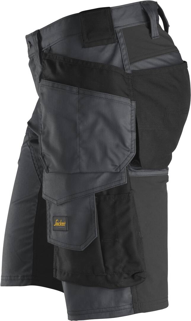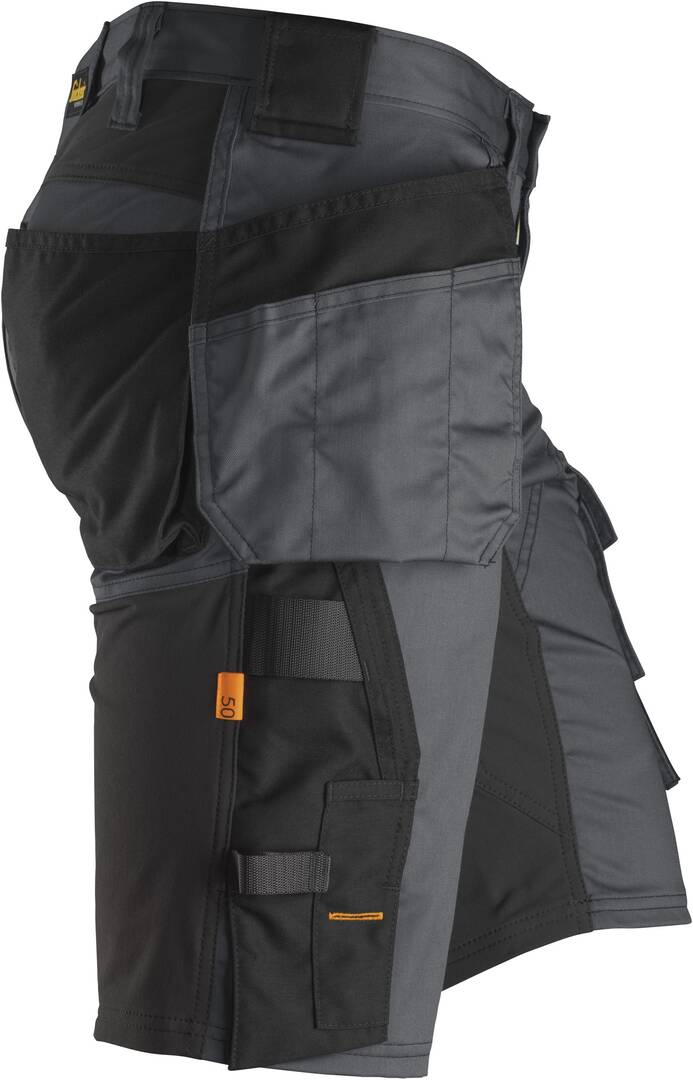 Short de travail stretch avec poches holster. Porte-outil avec bande auto-agrippante. Poche sur la jambe avec attache pour couteau. Boucles avant avec porte-clé. Poche cargo classique avec attache pour badge d’identification.
