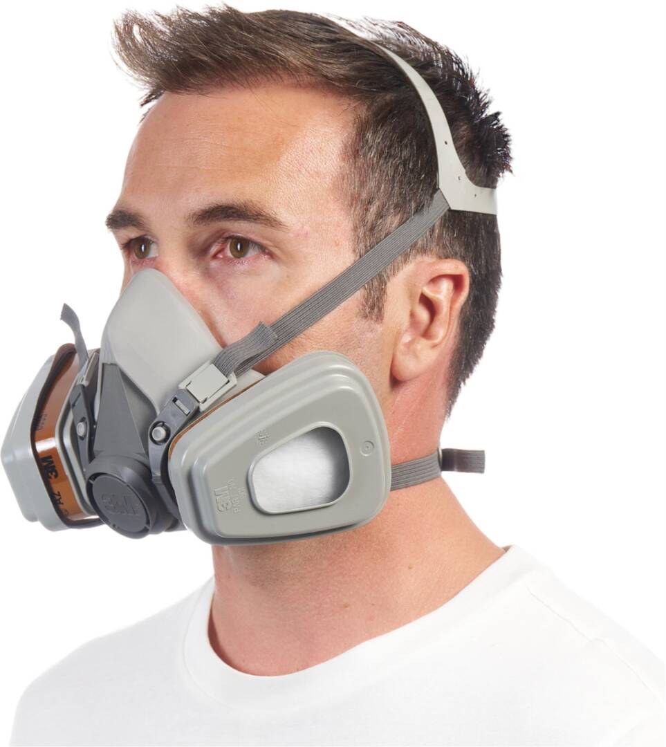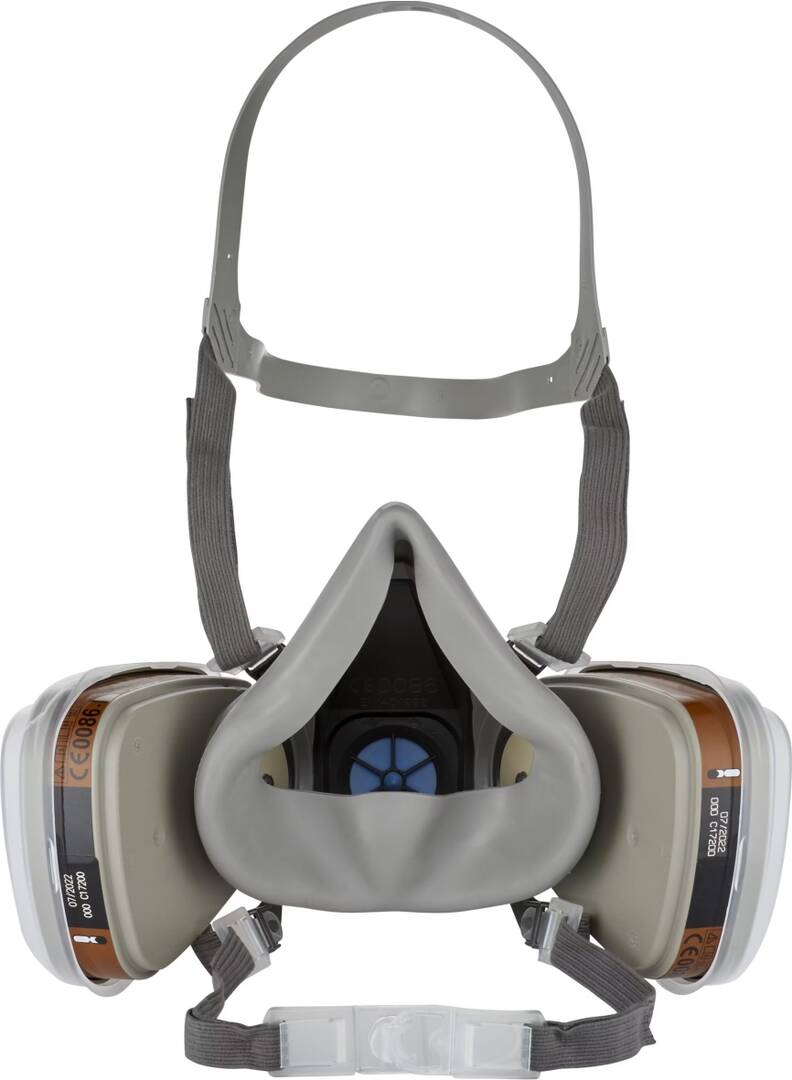 Kit demi-masque réutilisable. Avec masque 6200M, 2x 6055 A2 filtres, 4x 5925 P2R filtres, 2x 501 couvercles, 4x 105 de chiffons de nettoyage. Filtres de protection contre les gaz, vapeurs et particules. Harnais de tête et bride de cou facile à serrer. Élastomère léger pour plus de confort durant les longues périodes de travail. Design profilé réduisant les interférences avec le champ de vision. Fixation à baïonnette s'adaptant à un large éventail de filtres. Compatible avec les filtres 3M™, série 2000, 5000 et 6000.