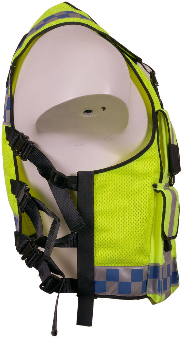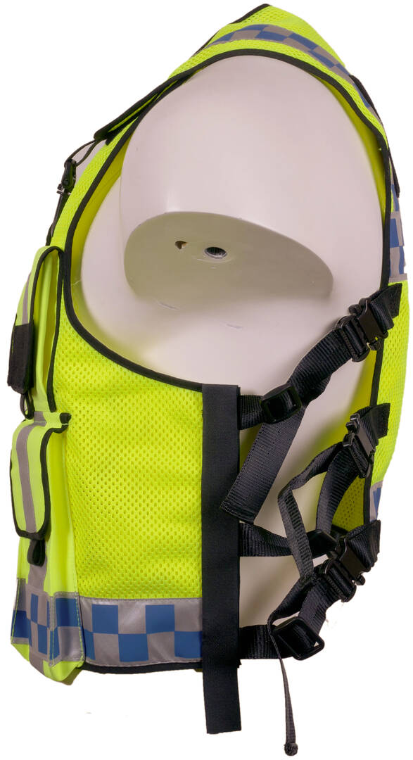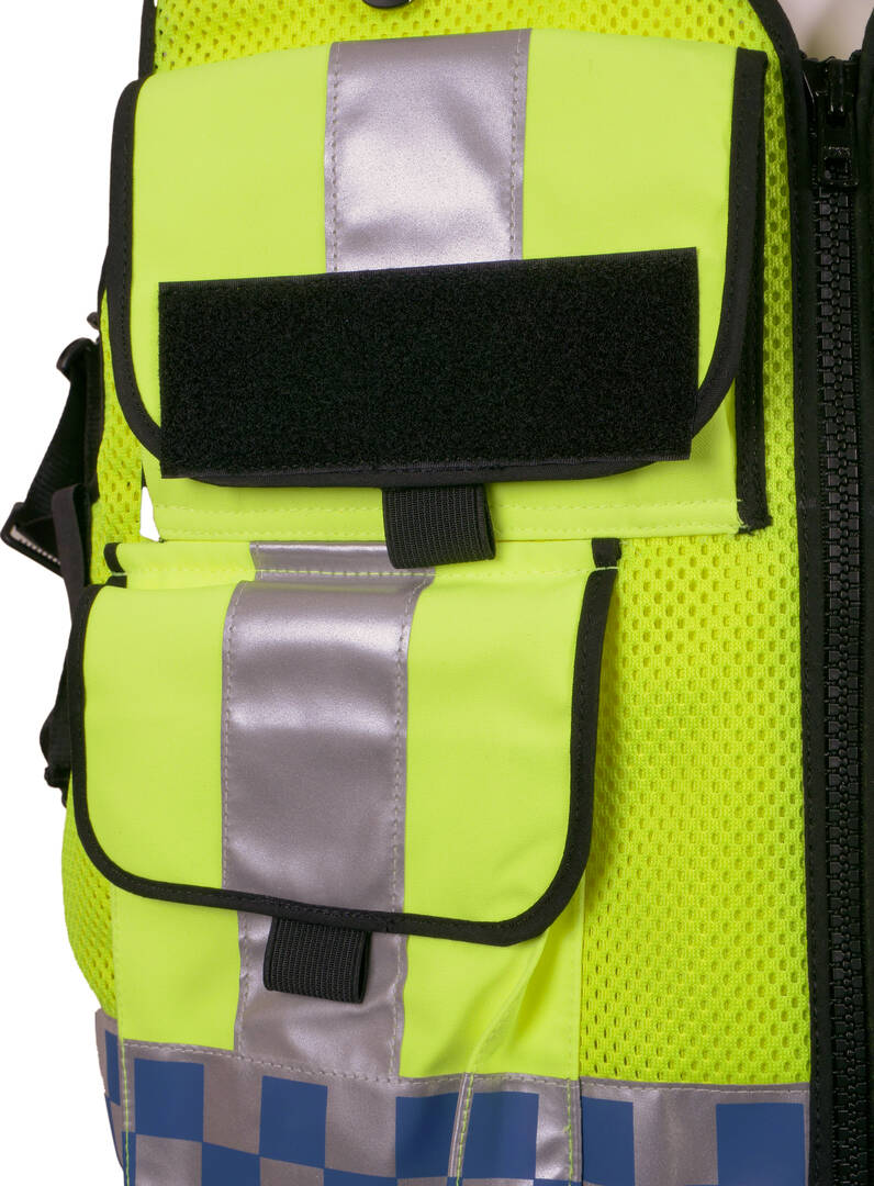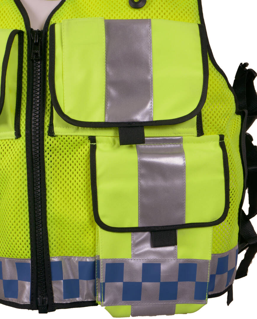Gilet double couche avec mailles ajourées. 4 poches extérieures à à rabat. 2 mousquetons porte-outils. Velcro sur poche droite et au dos pour appliquer une plaquette d'idenfication. Fermeture à glissière devant. Réglages de côté par sangles. Bandes réfléchissantes grises, damiers bleus.
