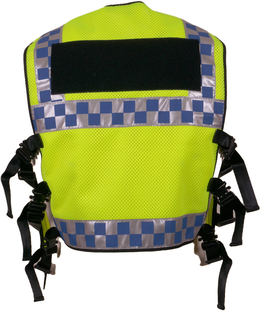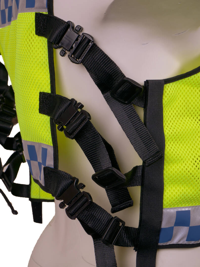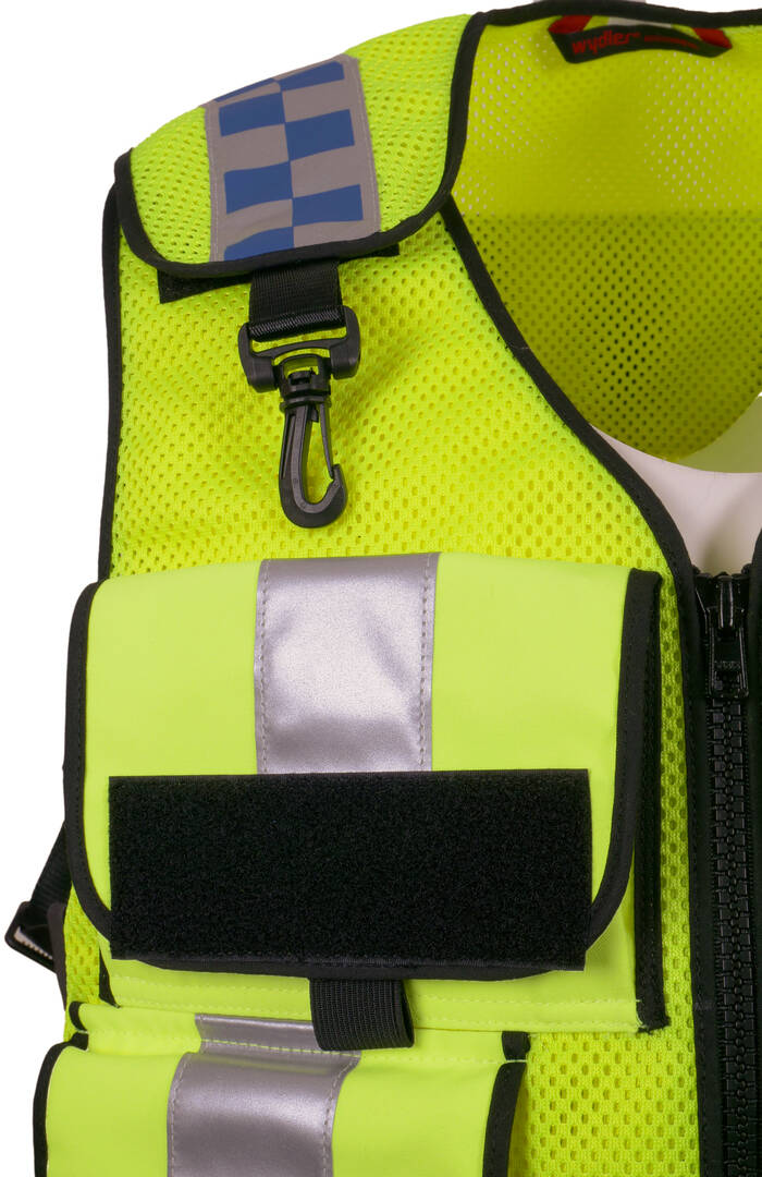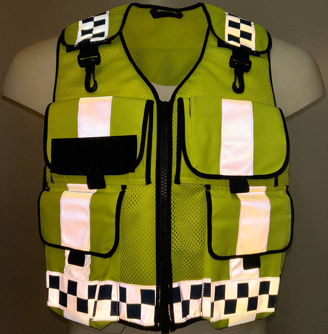 Gilet double couche avec mailles ajourées. 4 poches extérieures à à rabat. 2 mousquetons porte-outils. Velcro sur poche droite et au dos pour appliquer une plaquette d'idenfication. Fermeture à glissière devant. Réglages de côté par sangles. Bandes réfléchissantes grises, damiers bleus.
